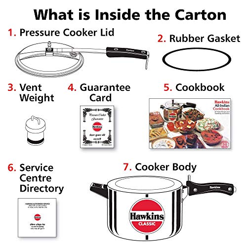 Included Components:1 – Cooker Body, 1 – Cooker Lid, 1 – Vent Weight, 1 – Rubber Gasket, 1 – Guarantee Card, 1 – Cookbook, 1 – Service Centre Directory